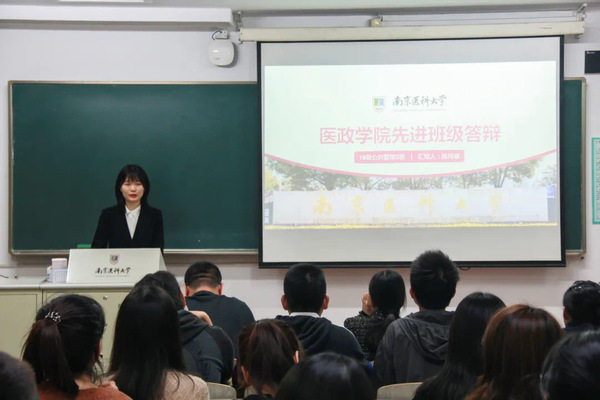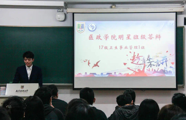 首先进行答辩的是2017级卫生事业管理1班的马海峰同学。他介绍2017级卫生事业管理1班以“趁青春,不言弃”为班风,全体同学一心向党、学风浓厚、热心公益、爱舍如家。