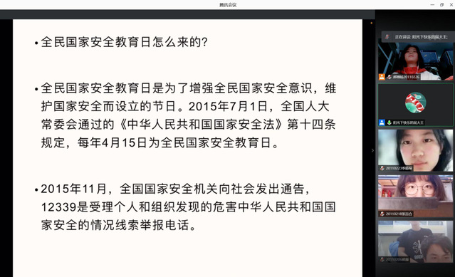 2021年4月15日是第六个全民国家安全教育日,为增强医政学子安全意识,学院组织召开安全教育宣讲活动,2019级、2020级同学参加。各班综管委向同学们普及了有关国家安全的知识,并观看了相关视频。