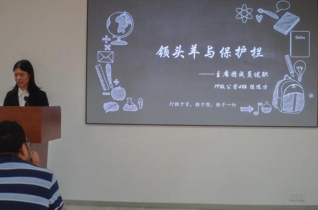 2019级公共管理4班的陈远方担任院分团委执行主席一职。她认为学生干部的作用可以形象概括为“领头羊”和“保护栏”,学生干部既要做好引导作用,也要提高学生们参加活动的积极性。