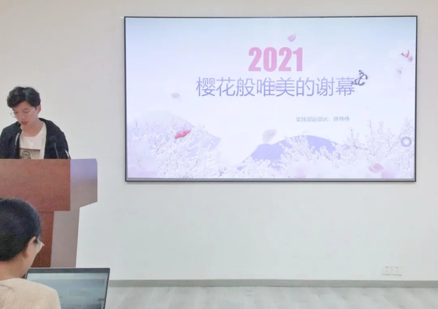 实践部负责人陈伟伟以樱花飘落之意象,忆当初入部时的发言。他在时隔多届又重启的义卖活动中尽心尽力,圆满地续写了荣光。