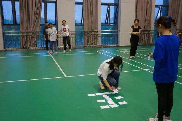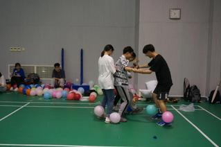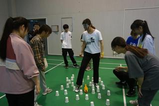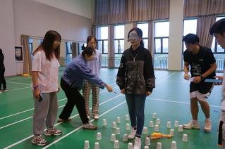 第二项运动是“蒙眼纸杯阵”,每组选一位选手蒙眼,其他选手指挥其越过纸杯阵,期间至多触碰4个纸杯,纸杯中的纸条决定相应奖惩。蒙眼走阵者,但闻耳边指令四起,脚步悬空,迟迟不敢落下;别有用心者,故意干扰指令,将走阵人往陷阱上引,每当阵中惨叫的声音大放,顿时全场瞩目,开怀大笑。