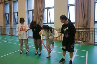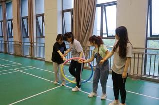 第一项运动是“呼啦圈过山车”。四位选手一组,要求在尽可能短的时间内穿过呼啦圈,期间四人手牵手站成一排,不可松手触碰呼啦圈。