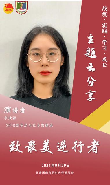 9月29日,由2018级社会与劳动保障班郑欣颖同学带来“战‘疫’·实践·学习·成长”主题云分享——《致最美逆行者》。