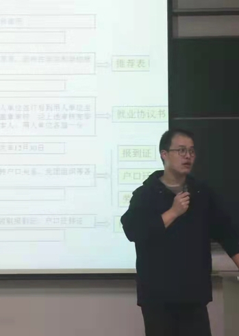 陶老师主要就“毕业生就业流程”“就业推荐表”“就业协议书”“就业报道证”“个人档案”这五个方面进行讲解。