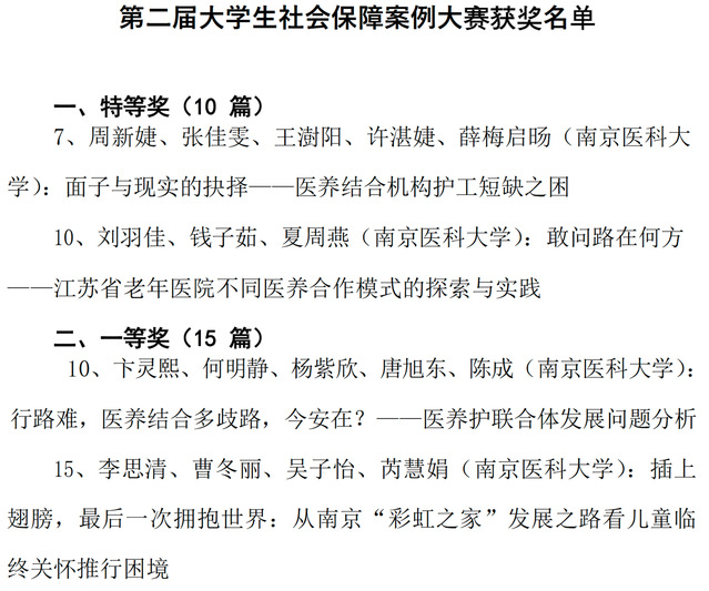 我院在此次大赛中喜获特等奖两项、一等奖两项。其中,由陆方副教授指导,刘羽佳、钱子茹、夏周燕同学完成的“敢问路在何方——江苏省老年医院不同医养合作模式的探索与实践”和周新婕、张佳雯、王澍阳、许湛婕、薛梅启旸同学完成的“面子与现实的抉择——医养结合机构护工短缺之困”荣获大赛特等奖;由陆方副教授指导,卞灵熙、何明静、杨紫欣、唐旭东、陈成同学完成的“行路难,医养结合多歧路,今安在?——医养护联合体发展问题分析”荣获大赛一等奖;由詹祥副教授指导,李思清、曹冬丽、吴子怡、芮慧娟同学完成的“插上翅膀,最后一次拥抱世界:从南京“彩虹之家”发展之路看儿童临终关怀推行困境”荣获大赛一等奖。