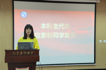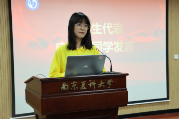 本科生新生代表应家馨同学发言。她表示,美好的蓝图在南医奠基,美好的生活也将从医政开始,“幸逢盛世,当不负盛世”,青年人应该主动扛起时代赋予的责任和担当,勇往直前,以青春之我,创建青春之家庭,青春之民族,青春之国家。