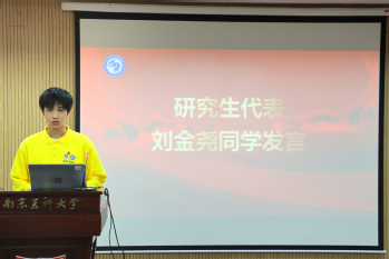 研究生新生代表刘金尧同学发言。在学弟学妹们开启求知问学新阶段的重要时刻,他分享了自己学习道路上的感悟,鼓励大家带着求真务实的心态去学习,去探索,去实践。博采众长,力求创新,一起做脚踏实地的南医人!