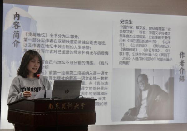 卫管3班董扬扬同学分享了史铁生的著作《我与地坛》,以“向死而生”为核心思想涵盖了读书心得,感叹道:“在生活中要勇于面对困难与挫折,从“死”开始思考生命的意义,寻求突围的出口和活下去的理由。”