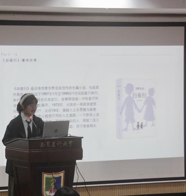 卫管1班张书源同学分享了东野圭吾的《白夜行》,向同学们介绍了作者、小说的内容和心得。这本书将无望却坚守的凄凉爱情和执著而缜密的冷静推理完美结合,是一本不可多得的推理佳作。