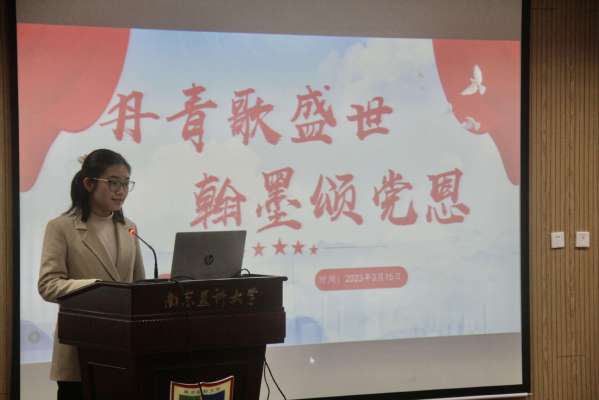 卫管2班罗素江同学分享了二十大学习心得,以“丹青歌盛世,翰墨颂党恩”为题赞颂了党的丰功伟业和如今的河清海晏。罗素江同学从二十大摘录、党创盛世、砥砺奋斗三个篇章展开,简要介绍了二十大中党的新思想,回溯历史歌颂中国共产党带领中国人民从站起来到富起来到强起来的伟大飞跃。最后指出我们当赓续前行,激励青年人履践致远,愿我们“初心如磐俭使命,奋楫笃行谱新篇”。
