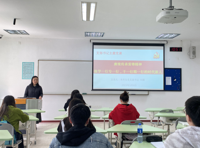 3月6日上午10点30分,医政学院本科生党支部书记刘璐走进明达楼503教室“赓续传承雷锋精神,做学一行专一行,干一行精一行的时代新人”党支部主题党课,为学生党员、入党积极分子及学生干部代表讲授本学期第一堂党课。
