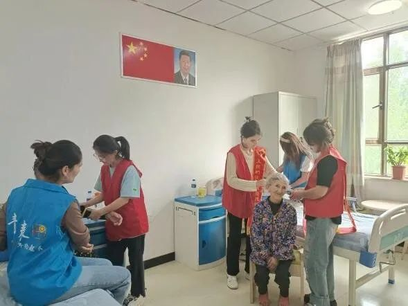 在养老院,成员们帮助行动困难的老人梳理头发,适当的按摩下身子,同时也帮忙收拾室内室外卫生。