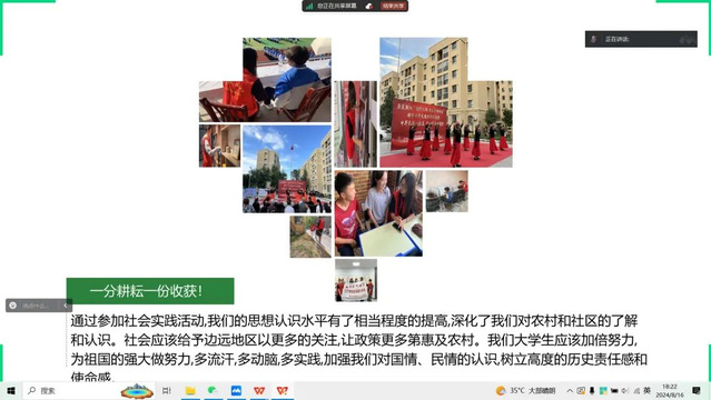 社会实践活动结束后,团队成员在线上进行了实践活动总结,共同回顾这几天的实践成果。大家在会议中汇报总结,进行活动反思。回想这些活动,大家都各有收获,受益匪浅。至此,经团队成员的合作暑期社会实践活动圆满结束。