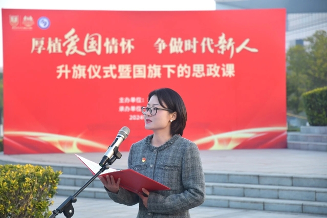 南京医科大学马克思主义学院钱美玲老师为现场师生作主题为《夯实人民健康之基,推进中国式现代化》国旗下的思政课。钱老师回顾了新中国成立75年来卫生健康事业的发展历程,从人均寿命提升、医疗资源优化到积极参与全球卫生治理,展现了中国卫生健康事业的巨大成就,以及南医在人才培养、医防结合等方面的努力。她鼓励南医学子传承五四精神,为护佑人民健康担当青春责任。