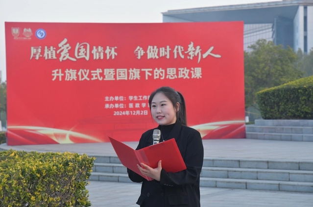 12月2日清晨,医政学院举行“厚植爱国情怀,争做时代新人”升旗仪式暨国旗下的思政课。医政学院党总支书记陈勇,副书记、副院长张华,公共管理学系副主任陆方,辅导员李敏、饶婷婷以及2023、2024级本研学生,全体学生党员和入党积极分子参加升旗仪式。仪式由医政学院研究生党支部副书记苗开欣主持。