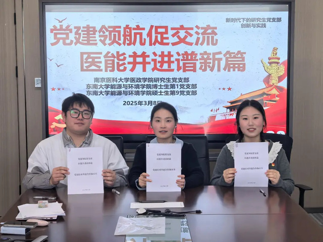 为进一步激发支部动力,推动支部党建与科研紧密融合,更好地发挥党支部引领作用,南京医科大学医政学院研究生党支部与东南大学能源与环境学院博士生第1党支部、硕士生第9党支部于3月8日开展党建结对共建活动。