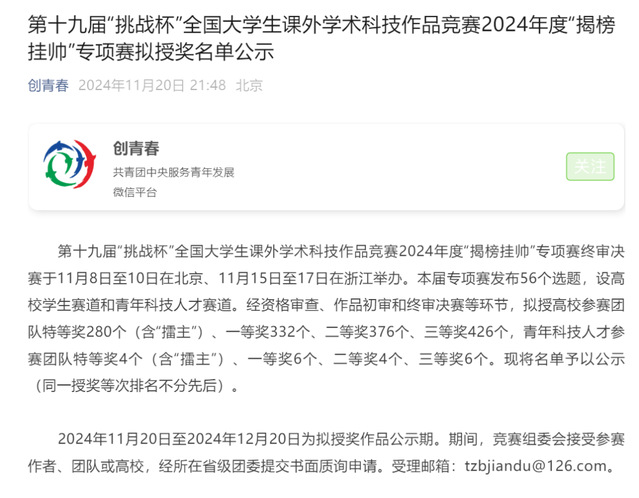 第十九届“挑战杯”全国大学生课外学术科技作品竞赛2024年度“揭榜挂帅”专项赛于近日公示获奖名单。本届专项赛发布56个选题,我院学子吴若脩团队项目《医心向阳,逐光而行——护佑医学生的“心”征程》经过激烈角逐,脱颖而出,荣获全国二等奖。