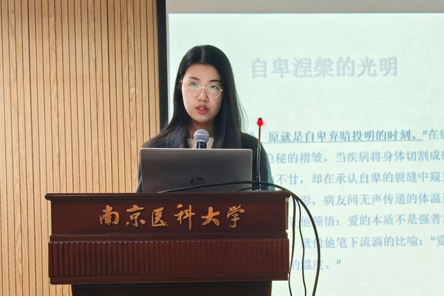 2024级卫管3班的张乐晨同学,通过“皈依之路”“爱、生命和死亡”两个部分分享《病隙碎笔》的阅读感悟——在皈依之路上叩问生命真谛。她从书中感受史铁生对生命的坚韧与智慧,深刻思考人生意义。