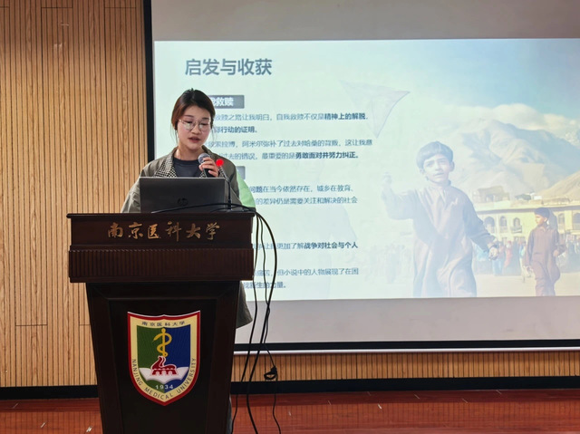 2023级医保班的陈心愿同学,分享的是《追风筝的人》读后感,她剖析了阿米尔、哈桑等角色复杂多维的特质,更巧妙地将人物命运与友谊的考验、背叛的苦楚、救赎及和解等普世主题相交织,引领听众一同探索人性的深度与广度。