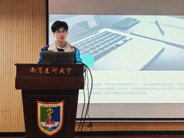 2023级卫管2班的史新超同学围绕主题“裂痕中的棱镜”分享了陶勇和李润创作的随笔集《目光》。书中许多医患间的故事牵动心绪,在感动之余,也让读者对复杂人性有了更进一步的思考。