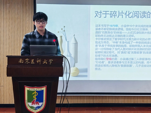 2024级卫管2班的罗浩铭同学以“存在大于效用”为主题,介绍了卡尔维诺的《如果在冬夜,一个旅人》。该书的断裂结构和“不断的中断”让他不禁去思考阅读的终极意义。生活恰似读书,其意义也许在于它永远在途中,不必追寻结果,却爱其本身。