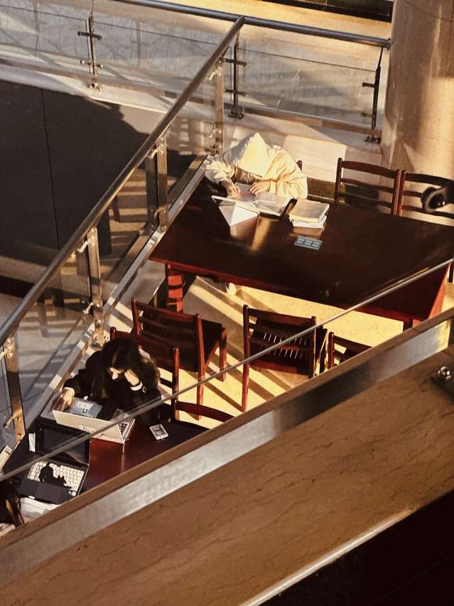 本作品捕捉了图书馆内温馨的瞬间,阳光斜洒,透过窗户映照在木质桌椅上,光影交错间透露出温暖的气息。作品不仅展现了学生们的专注与投入,更传递出图书馆内宁静而深远的学习氛围,让人感受到学习的力量与美好。——王秋潼
