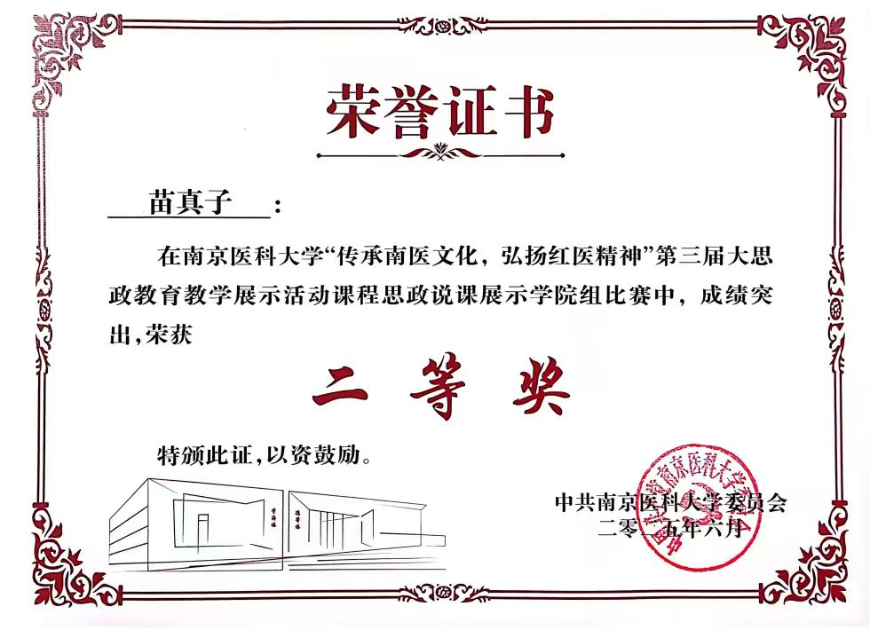 在“传承南医文化,弘扬红医精神”第三届校大思政教育教学展示活动中,我院青年教师苗真子从40位参赛选手中脱颖而出,荣获学院教师组二等奖。