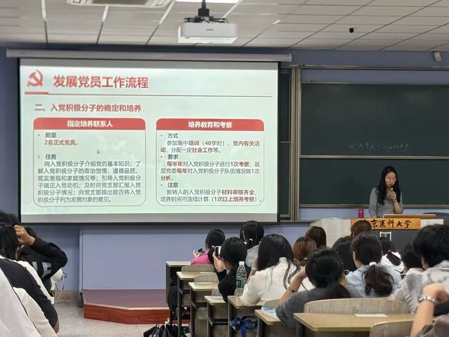 入团、入党,是青年追求政治进步的“人生三部曲”。李敏老师为全体学员详细剖析了发展党员工作的工作流程。从提交入党申请书、团组织推优、确定入党积极分子、确定发展对象到预备党员接收与转正,每一个环节都是青年身份与思想的升华,也激励着每一位医政学子不断追求思想进步、坚定政治信仰。