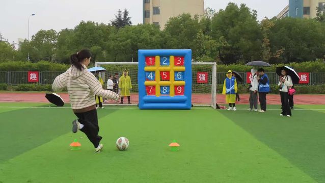 特色项目赛区,足球踢准赛场上,选手们精准控球,脚法娴熟,每一次飞跃的球都牵动人心,划出完美抛物线。最终,陈展妍同学在足球踢准中获得第五名。