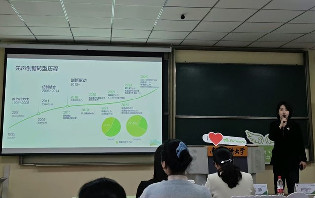 随后,先声药业集团神经科学事业部副总经理宋静发言,为在场同学系统介绍了先声药业的发展历程、核心创新产品管线、多元化的人才结构、持续加大的研发投入以及前瞻性的全球战略布局。她的精彩分享使同学们对先声药业的行业地位、创新实力与发展前景有了全面而深刻的认识。