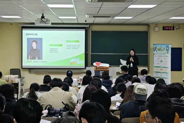 在宣讲会的最后环节,先声药业集团党委副书记、人力资源部副总监郑伟民女士发表讲话。她首先充分肯定了南京医科大学毕业生在企业的卓越表现,指出目前已有25位南医大校友在先声药业研发、制药、职能、营销四大系统中发挥着重要作用,其中近60%的人员已成长为业务骨干或管理者,成为公司发展的中坚力量。郑副总监重点介绍了先声药业为应届生量身定制的专项培养体系,该体系旨在系统性地帮助新人顺利完成从“校园人”到“职场人”的角色转变。同时,她也向同学们详细说明了公司为员工提供的具有竞争力的、完善的薪酬福利体系。在讲话尾声,郑伟民副总监清晰介绍了面向2026届毕业生的校园招聘整体流程,并热情邀请南医学子积极投递,加入先声药业共同成长。