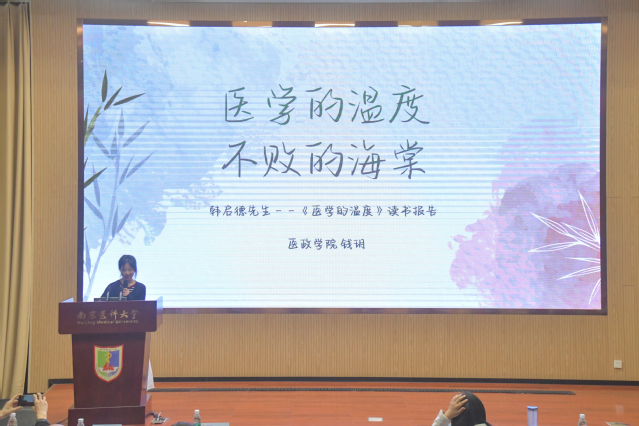 报告会上,我院25级本科生钱玥,作为第十七位分享人,以韩启德院士的著作《医学的温度》为核心,带来了题为“医学的温度,不败的海棠”的精彩分享。她从韩启德院士的医学经历切入,讲述了院士早年扎根陕西基层从医十一年、后深耕心血管药理研究的故事,让在场师生感受到了一代医学大家扎根一线、深耕科研的初心与坚守。